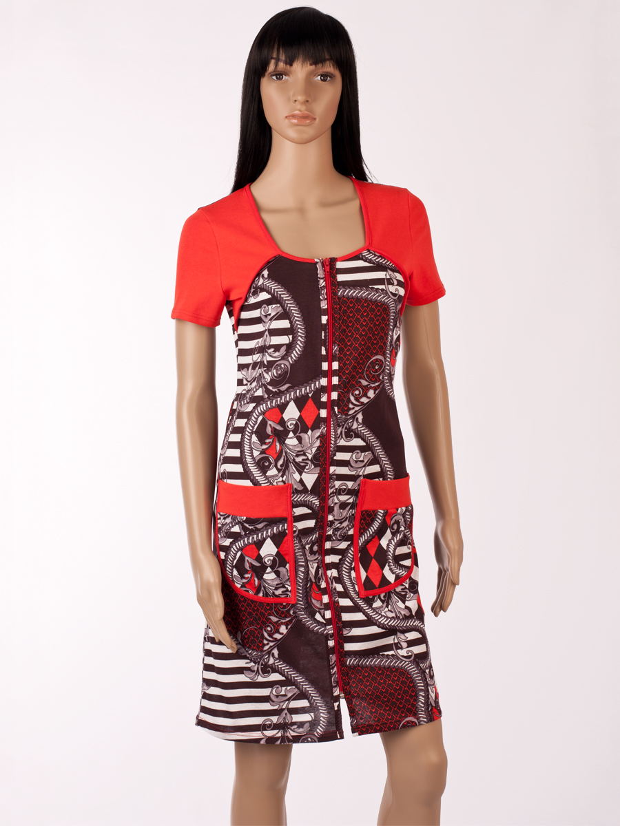 Красивый женский халатик с карманами на молнии ХЖ-19 абстракция 207 (красный, чёрный) - прекрасный выбор! Он пошит из легкого приятного на ощупь хлопка. Идеальная модель на каждый день. Отлично сочетает в себе практичность материала и его привлекательность.