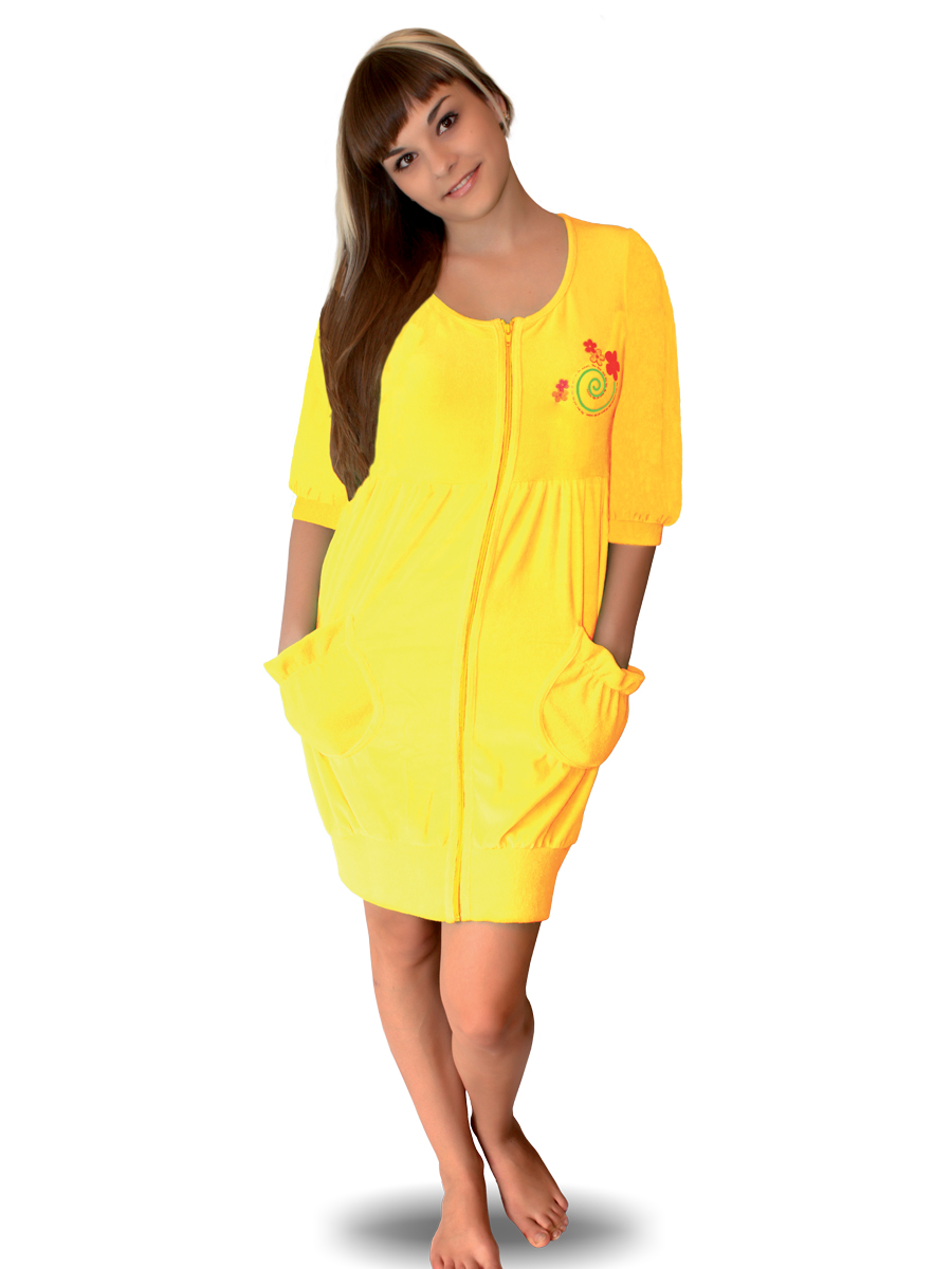 Велюровый халат 3/4 рукав ХЖ-07-02 жёлтый (жёлтый) очень удобный и практичный. Идеален для зимы. Подходит в качестве домашней одежды.