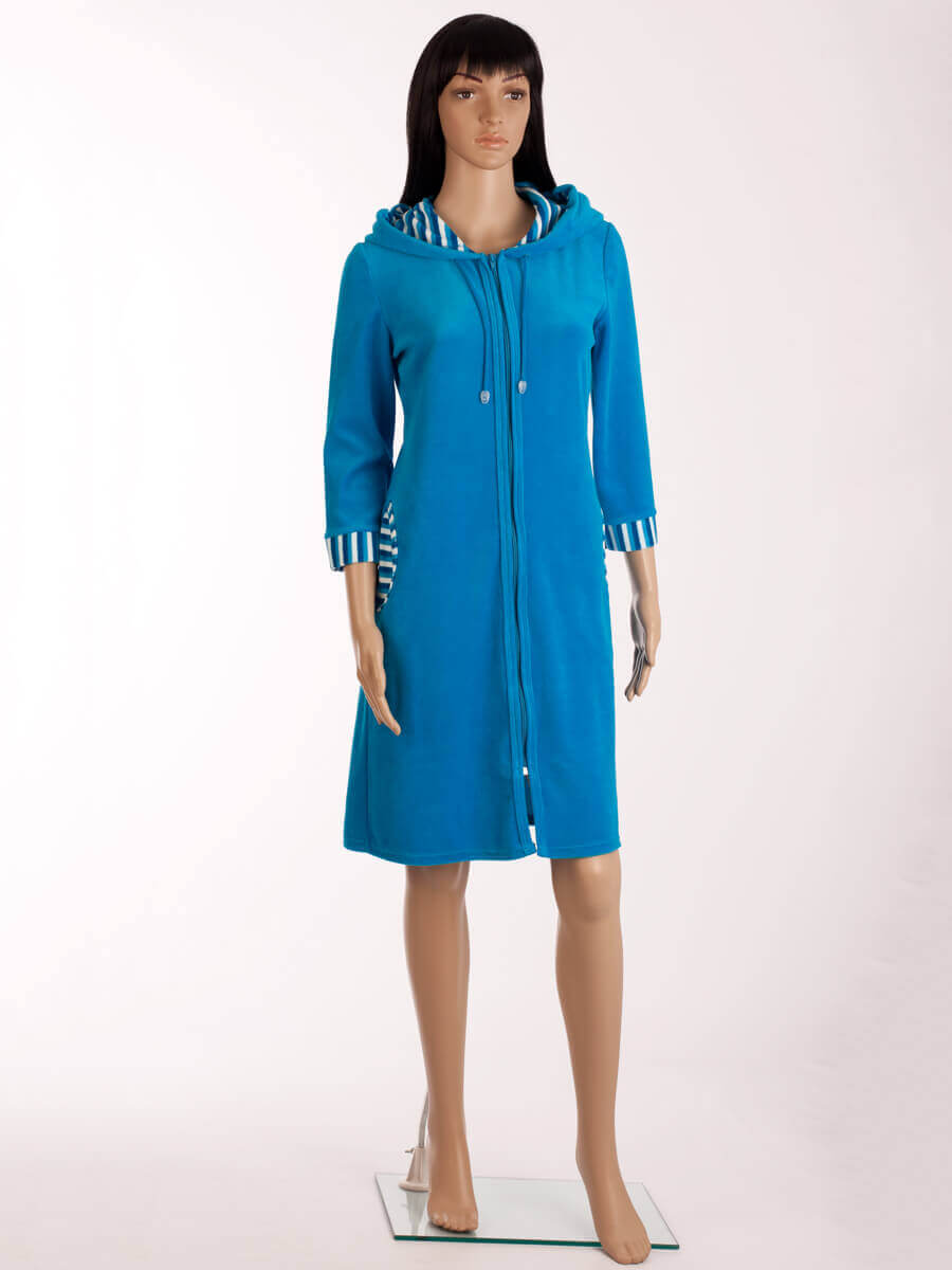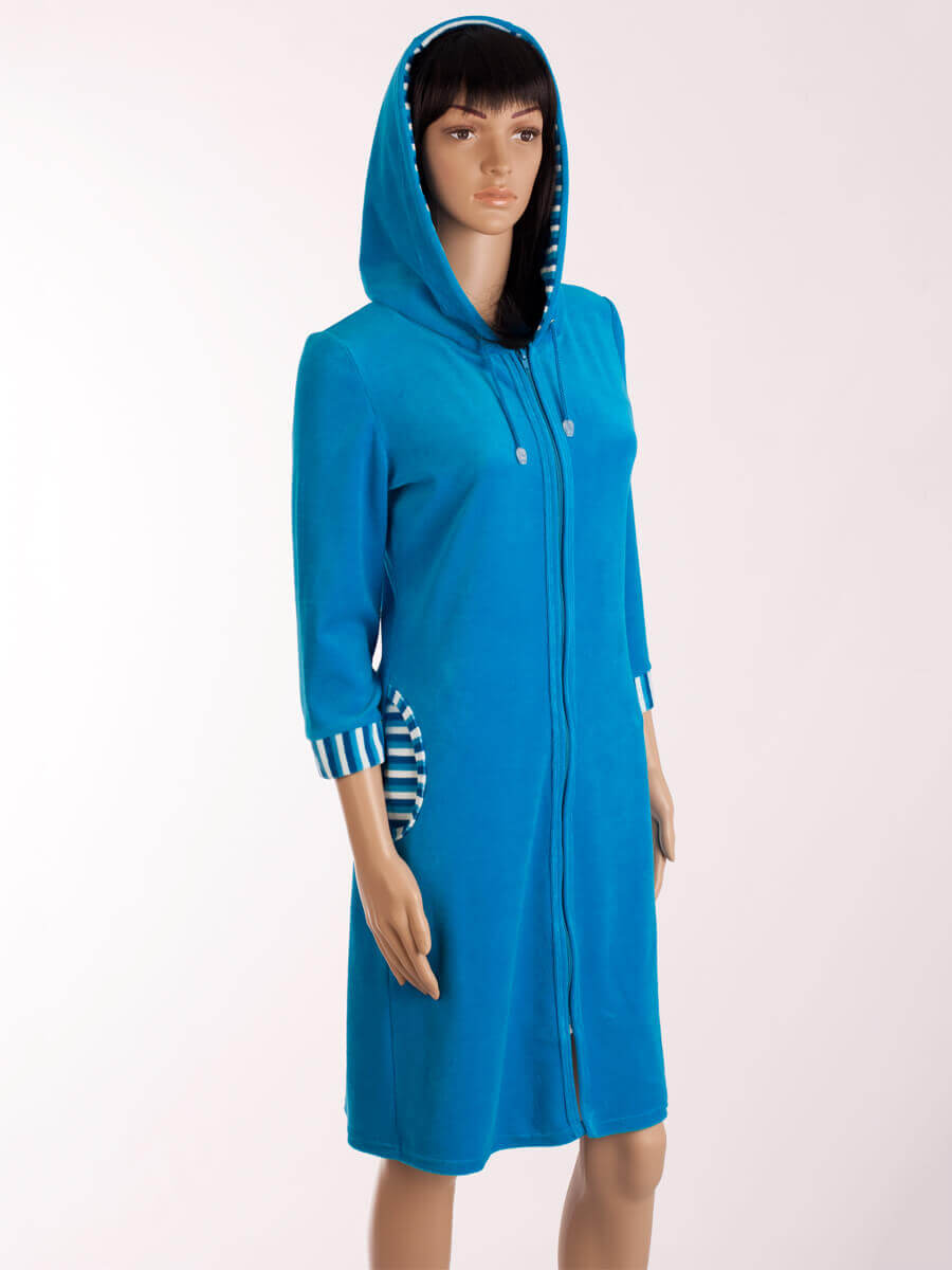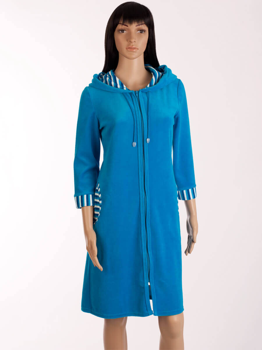 Велюровый халат на молнии с капюшоном ХЖ-13 бирюза (синий) - повседневная модель, которая подарит своей обладательнице настоящий комфорт. Утеплённый халат с капюшоном - отличный выбор. Он подойдет всем тем, кто небезразличен к практичной домашней одежде.